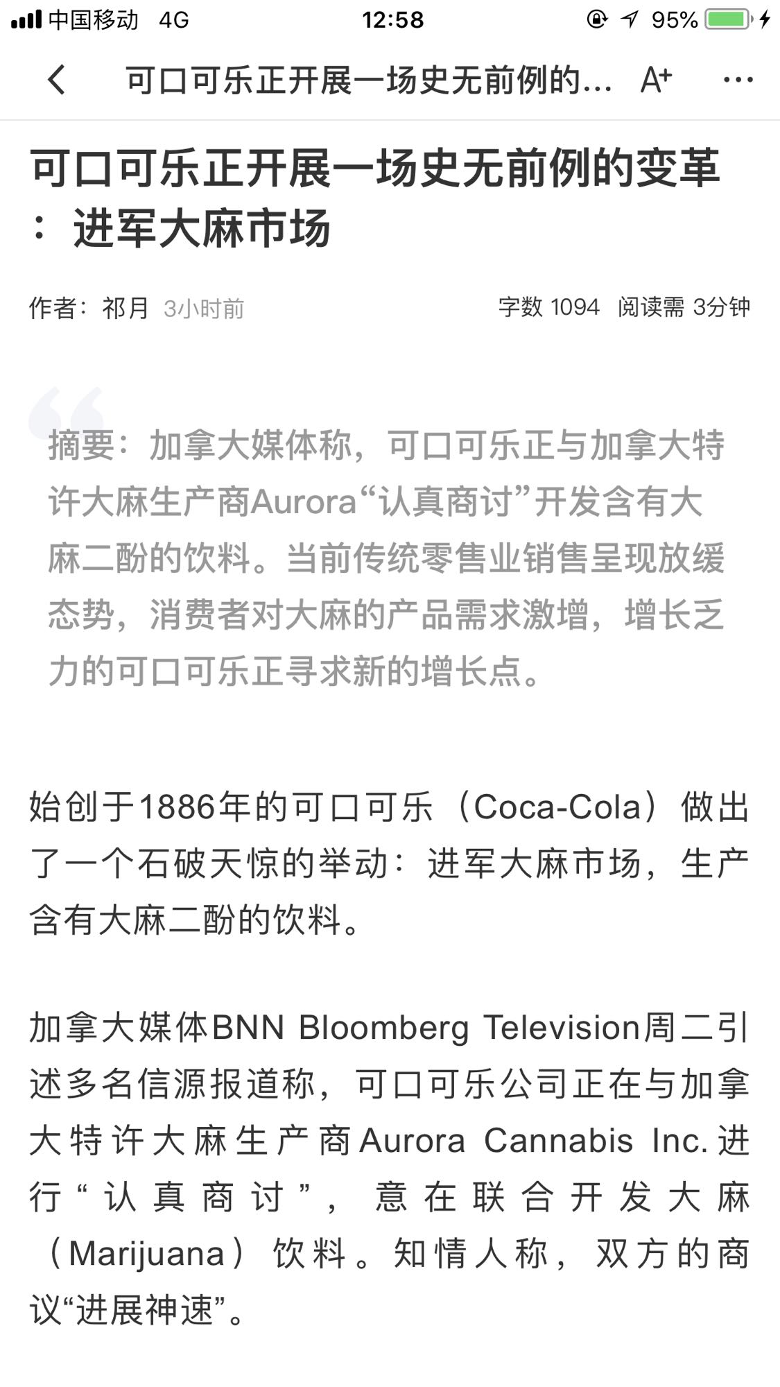 把视野放广一点,如果真的做出来大麻饮料,其他饮料公司也会效仿的,到时候市场肯定会打开,毕竟大麻供不应求
