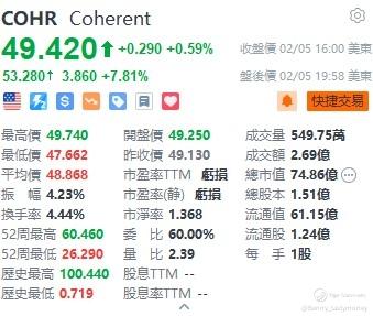 Coheren表示,其与人工智能/机器学习相关的Datacom收发器连续第三个季度出现强劲订单。公司超预期业绩,加上调高全年预期,盘后大升7.8%至53.28元。