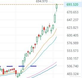 AI热潮大赢家英徫达昨晚再升近5%,差不多到700元了,之前预估会炒到700元再分拆股价,想不到这么快就升上去了。