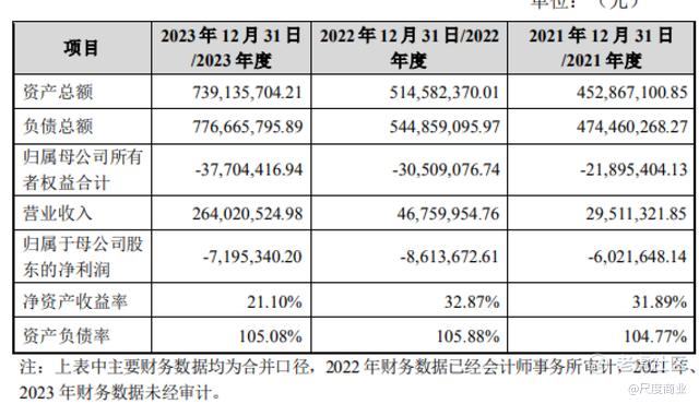 值得注意的是,江苏锋晖2021年至2023年,公司归母所有者权益是负资产,公司的负债总额高于公司的资产总额,资产负债率分别为104.77%、105.88%、105.08%,在2023年末存在着资不抵债的情况。
