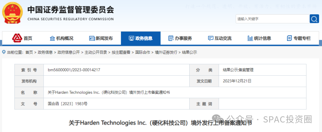 12月21日,中国证监会国际合作部发布关于Harden Technologies Inc.(硬化科技公司)境外发行上市备案通知书(国合函〔2023〕1983号)。