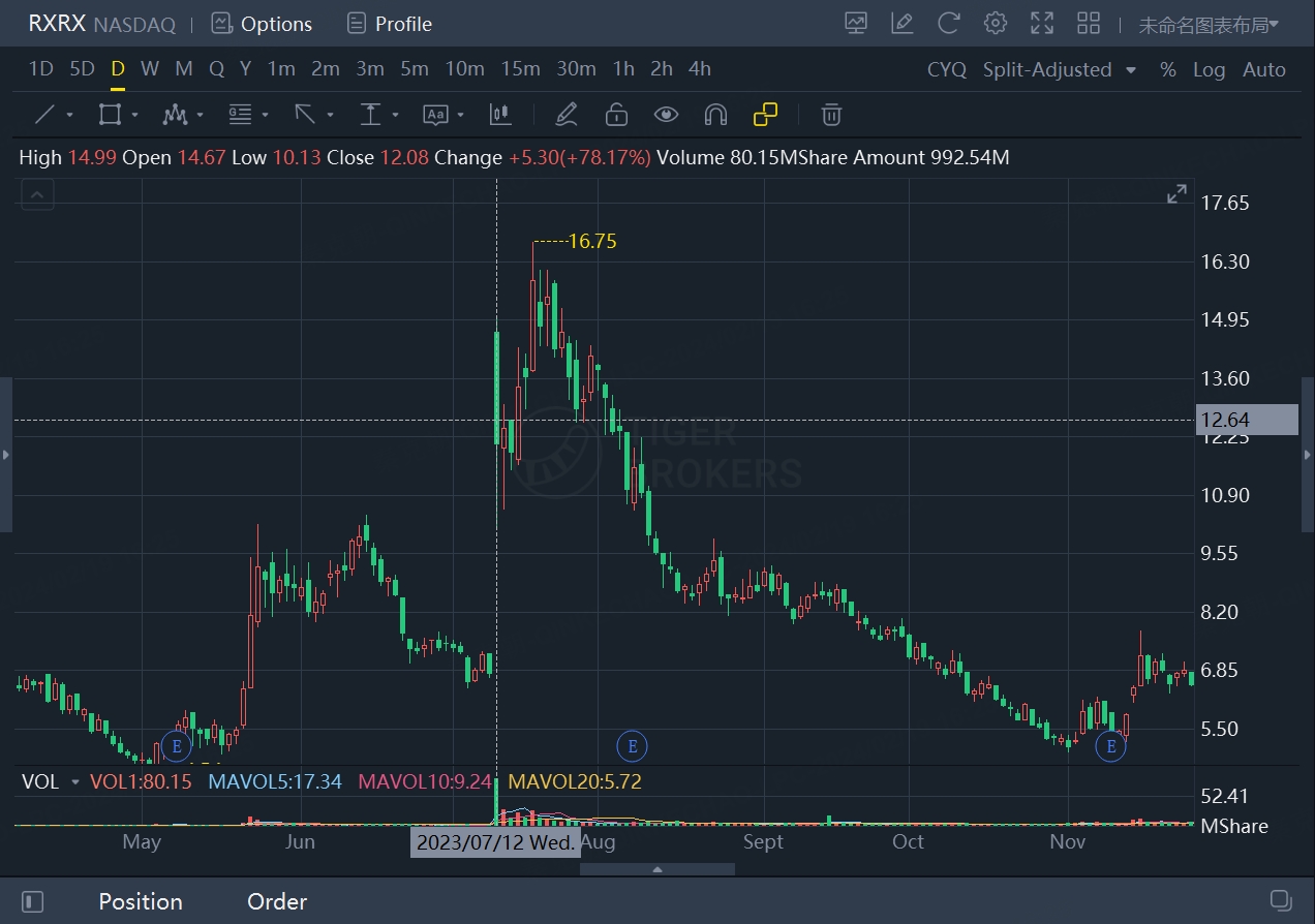 在AI制药领域,Recursion处于领先地位,早在2023年7月12日,英伟达的这笔投资就被曝光与众,当时也引发了Recursion股价暴涨,但炒作过后,Recursion股价一度创下新低: