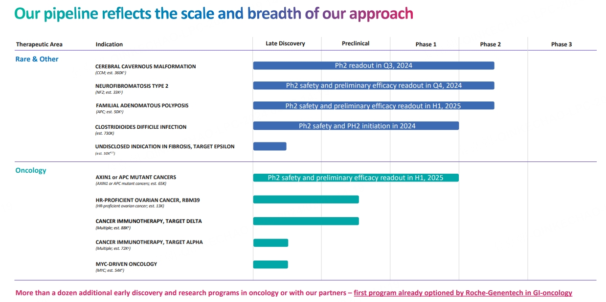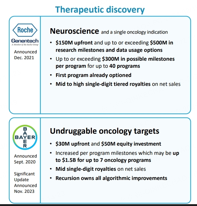 除了自己研发药物之外,Recursion还会与其他药企进行合作,帮助药物研发,如2021年公司与罗氏及旗下的基因泰克签订了一份协议,两家公司将在神经病学和癌症领域进行多达40个项目的合作,罗氏已经预付了1.5亿美元的预付款,未来Recursion还有望拿到数十亿美元的里程碑付款!