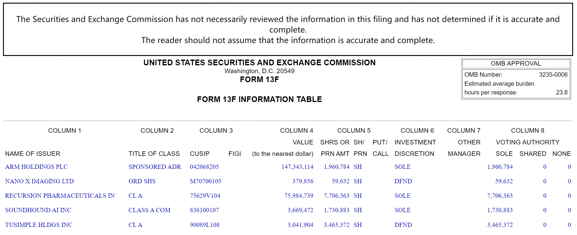 根据文件显示,英伟达共持有5支股票,分别是芯片设计公司ARM、生物技术公司Recursion、语音AI公司SoundHound、自动驾驶公司图森未来和医疗成像开发商NANO-X IMAGING: