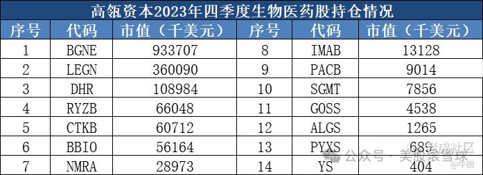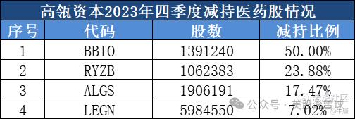 RYZB:一家在2023年9月上市的创新放射性药物公司,高瓴资本的持仓大概率是一级市场的投资,公司在12月26日被百时美施贵宝收购,高瓴资本也是顺势逢高减仓;不过,RYZB在IPO时,有116.3万股的老股东献售(selling stockholder),不排除高瓴资本在IPO时有献售的可能,而未等到企业被收购;