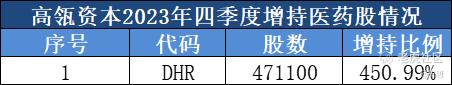 增持仓位方面,高瓴资本在四季度仅增持了一支医药股丹纳赫,但增持比例较大,达450.99%;