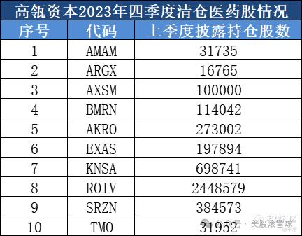 重点清仓1000万美元以下的持仓。四季度,高瓴资本清仓了多只三季末持仓市值低于1000万美元的医药股:PYXS、AMAM、SRZN、ARGX、AXSM、BMRN。