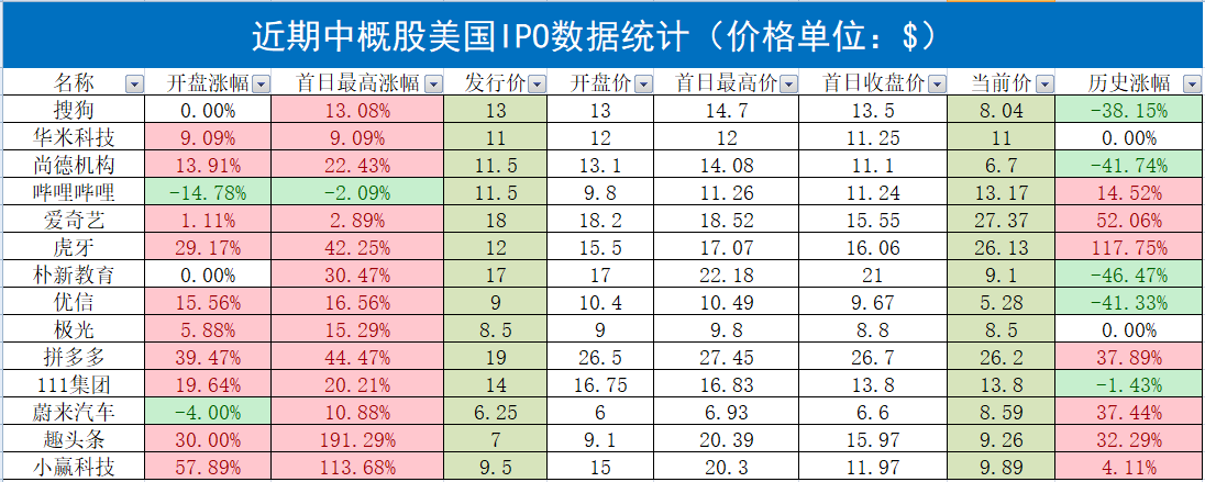 我今天花了一个半小时,统计了最近老虎打新的中概股情况,主要分析首日涨跌情况。