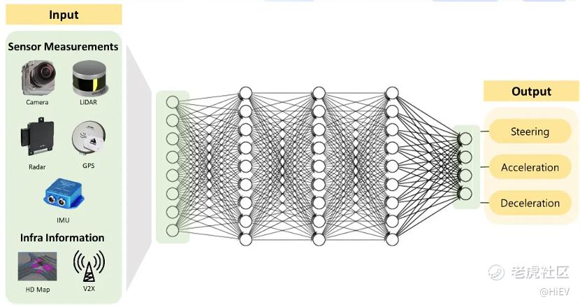 相比之下,特斯拉FSD的端到端方案采用全栈神经网络实现,直接输入传感器数据,输出转向、制动和加速信号,全程没有任何编码。