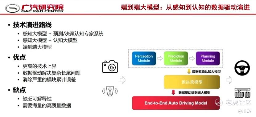 我们可以借用广汽研究院这张PPT,它很好地总结了端到端大模型相较于分模块方案的优缺点。