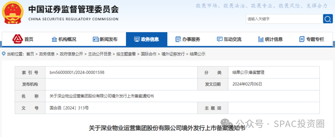 2月6日,中国证监会国际合作司发布关于深业物业运营集团股份有限公司境外发行上市备案通知书(国合函〔2024〕313号)。