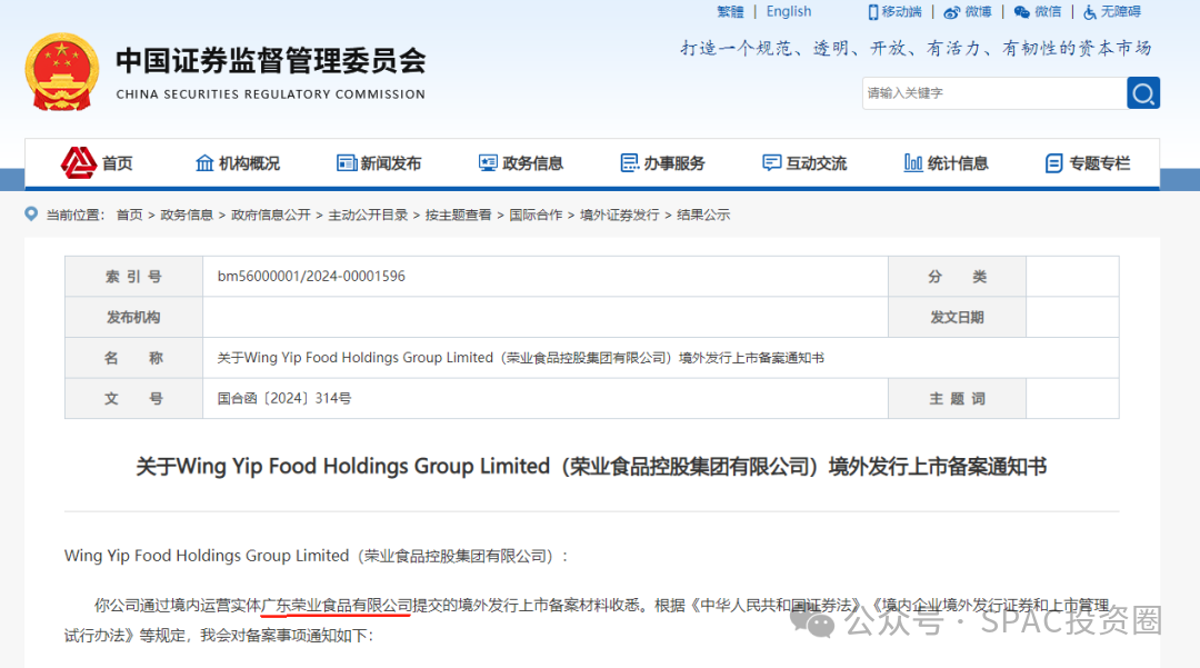 2024年2月6日,中国证监会国际合作司发布关于Wing Yip Food Holdings Group Limited(荣业食品控股集团有限公司)境外发行上市备案通知书(国合函〔2024〕314号)。