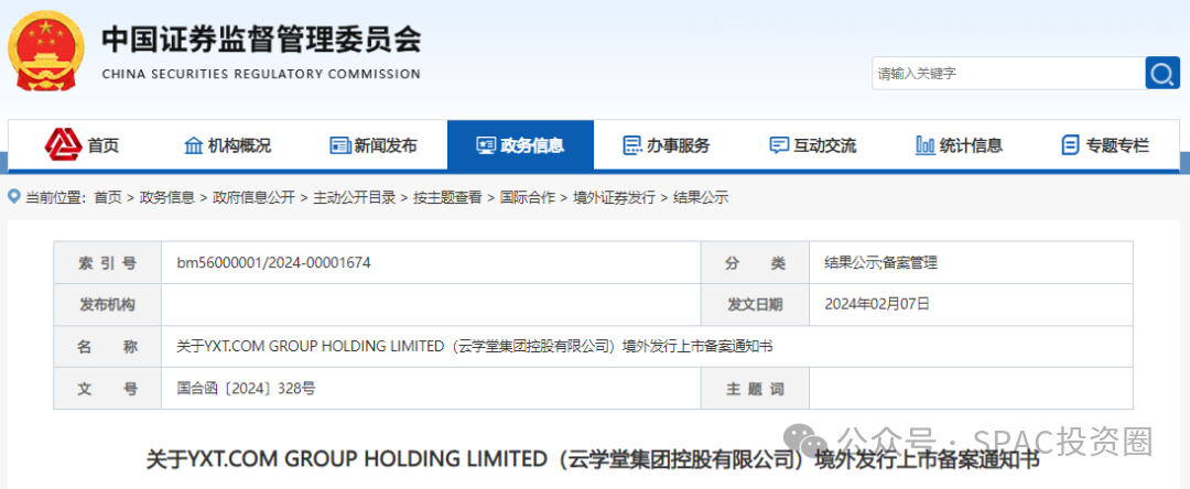 2024年2月7日,中国证监会国际合作司发布关于YXT.COM GROUP HOLDING LIMITED(云学堂集团控股有限公司)境外发行上市备案通知书(国合函〔2024〕328号)。