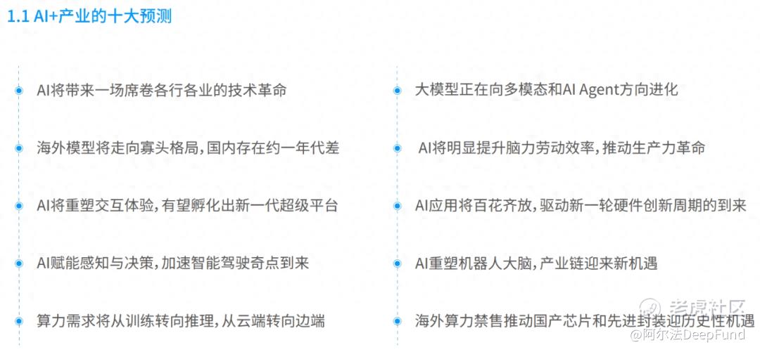 《报告》开篇,景顺长城科技团队对于AI+产业做出了十大预测,包括AI将带来一场席卷各行各业的技术革命;大模型正在向多模态和AI Agent方向进化;海外模型将走向寡头格局,国内存在约一年代差;AI将明显提升脑力劳动效率,推动生产力革命……