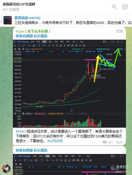 SMCI短线挤压失败,估计是要进入一个震荡期了,有很大概率会走个下降楔形,但GTC大会还有炒作,所以这个位置拉到1200美元的概率还是很大,不要做空。 今晚收盘价站稳1078美元,那就进一步上攻至1200美元,站不稳的话,可以获利走人了