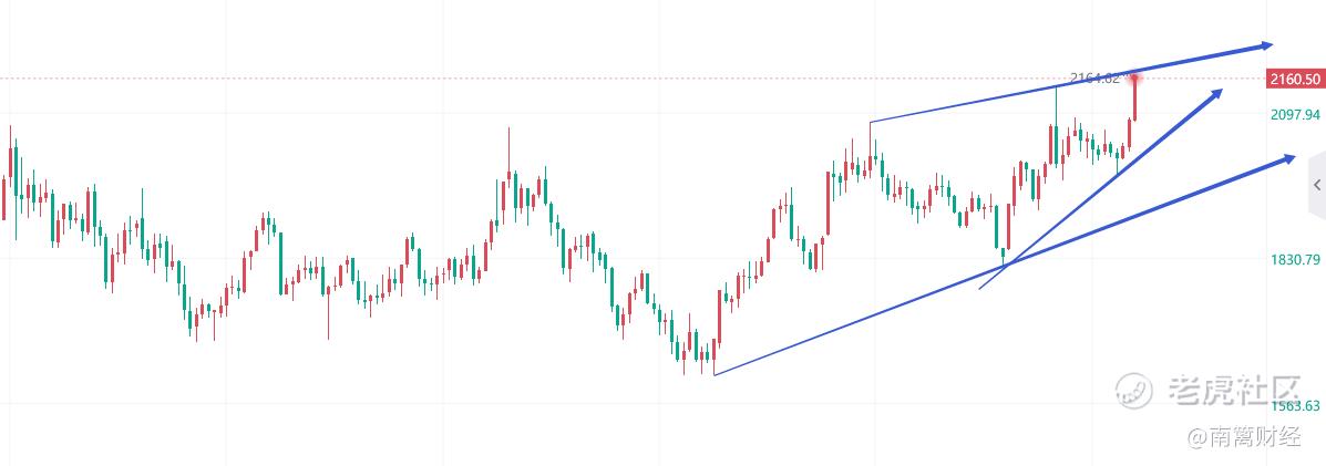 但同时观察黄金的上涨周期,由阶梯式上涨展开,此时阶梯略有缩减,故而可观察前低得失,来判断黄金是否有筑顶,或见顶之意。