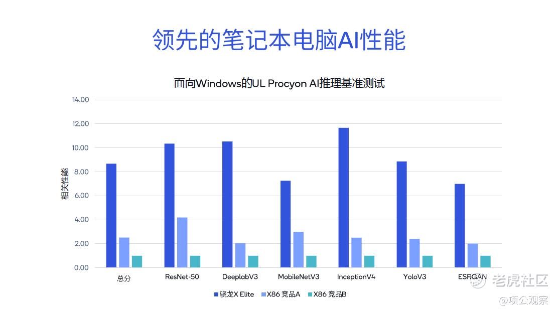进一步对比骁龙X Elite与其他X86架构竞品,在ResNet-50、DeeplabV3等测试中,骁龙X Elite表现出明显的领先地位,其基准测试总分分别是X86架构竞品A的3.4倍和竞品B的8.6倍。因此,在PC端,无论是运行Microsoft Copilot,还是进行文档摘要、文档撰写等生成式AI应用,体验都十分流畅。