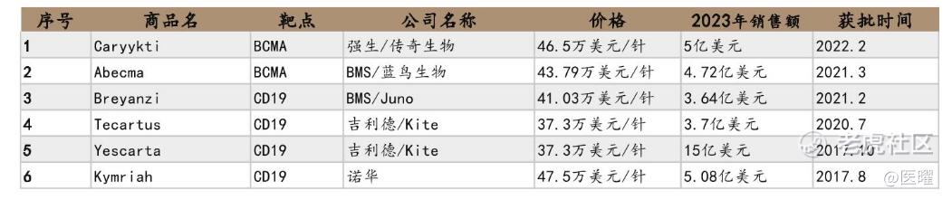 图:2023年全球CAR-T疗法销售情况,来源:德邦证券