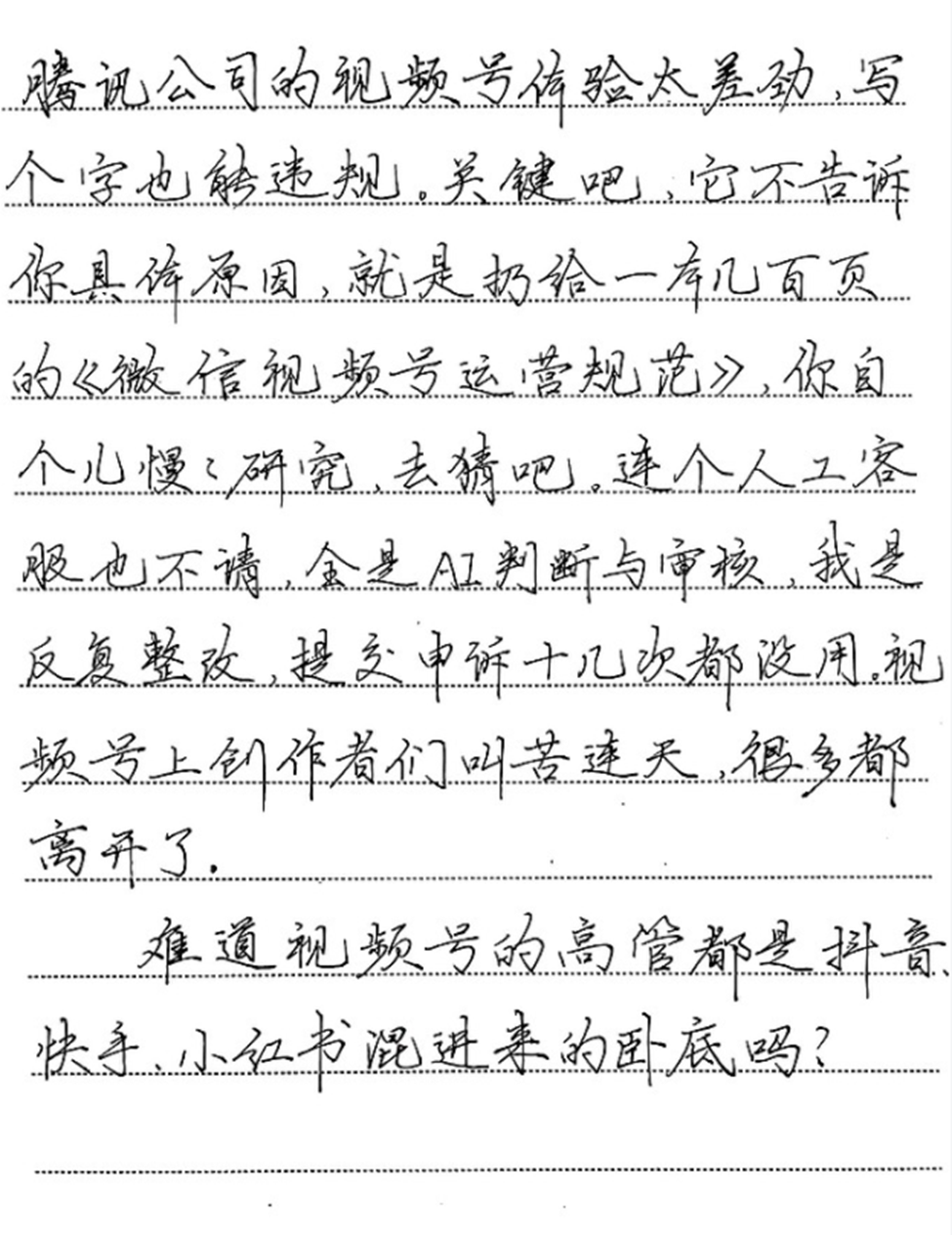 腾讯的股票不能买,视频号体验感太差劲,写个字也能违规。关键还不告诉你原因,扔一本几百页的运营规范给你,自己研究猜猜去吧。申诉十几回没用,全是AI判断和审核,没有反馈渠道。