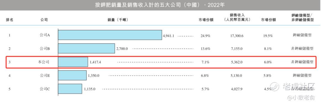 按销量计的中国五大钾肥公司于2022年的总份额为58.1%。本公司销量为1,417.4千吨,市场份额为7.1%,排名第三。