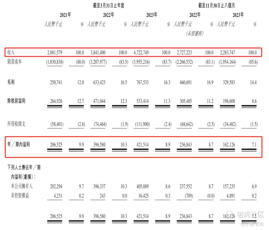 接下来看看公司经营情况,公司从2021~2023年营收分别是20.82亿、38.41亿、47.3亿,2023年营收同比增长22.94;2021~2023年的净利润分别是2.07亿、3.97亿,4.22亿,2023年的净利润同比增长6.29%。不过他这里的2023年是截止3月31日的,截止11月30日的2023年8个月的净利润其实是下滑的。