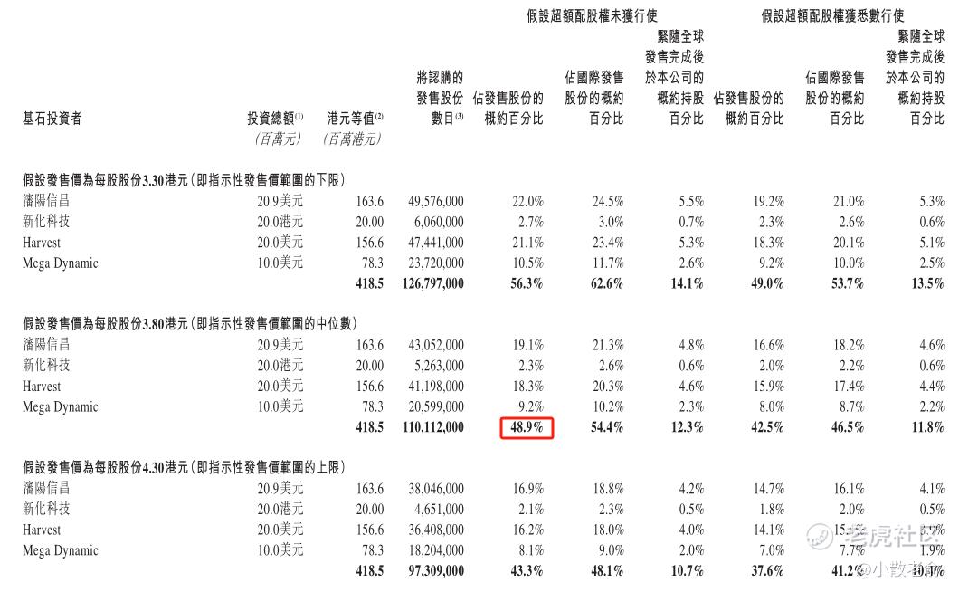 一共有4名基石,分别是渖阳信昌粮食贸易有限公司,新化科技有限公司,嘉实基金和Mega Dynamic Group Limited。按发行中间价计算,基石合计共认购4.185亿港元,占总发行数的48.9%,基石占比一般。