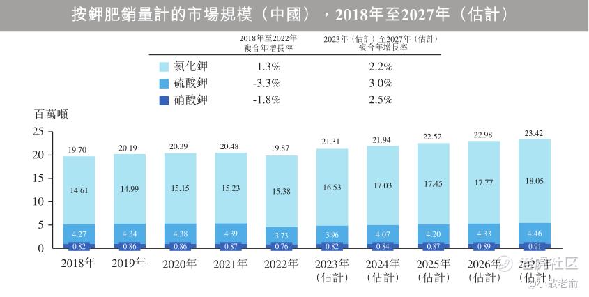 2022年中国按氯化钾销量计的市场规模达到15.38百万吨,占钾肥总销量的77.4%。2022年硫酸钾及硝酸钾的销量分别达到3.73百万吨及0.76百万吨。展望未来,预测按钾肥销量计的市场规模将会进一步扩大,氯化钾销量将由2023年的16.53百万吨增至2027年的18.05百万吨,复合年增长率为2.2%。到2027年,硫酸钾及硝酸钾的销量预期将分别达到4.46百万吨及0.91百万吨,两者于2023年至2027年的复合年增长率分别为3.0%及2.5%。