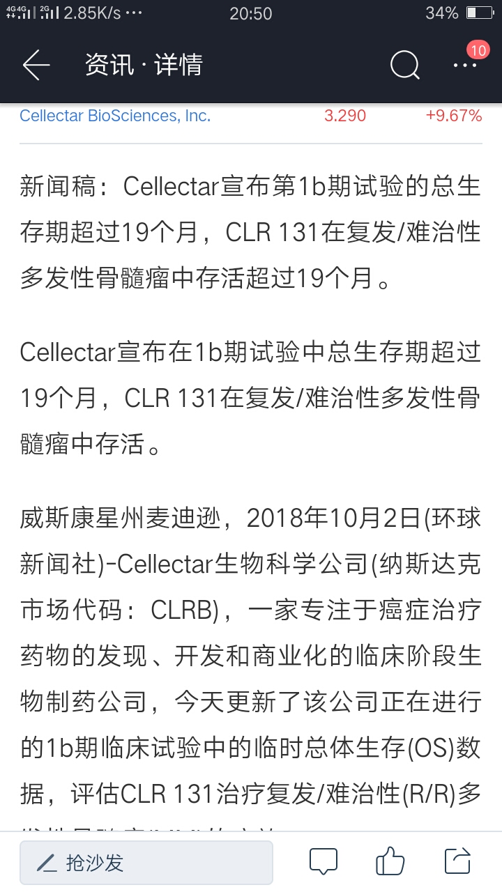 $Cellectar Biosciences Inc.(CLRB)$这属于利好的消息吧?😁