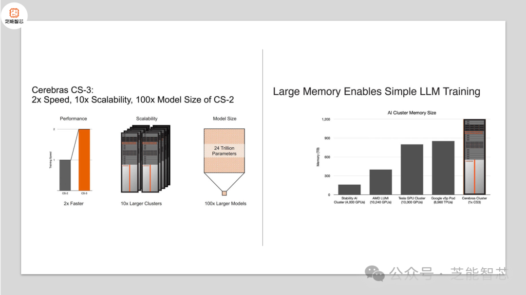 在当前的大规模集群中,通常会使用成千上万个GPU或AI加速器来处理问题,这导致了大量的芯片互连和网络成本,以及高能耗。而Cerebras通过保持整个芯片的完整性来解决了这个问题,从而显著降低了互连和网络成本以及功耗。