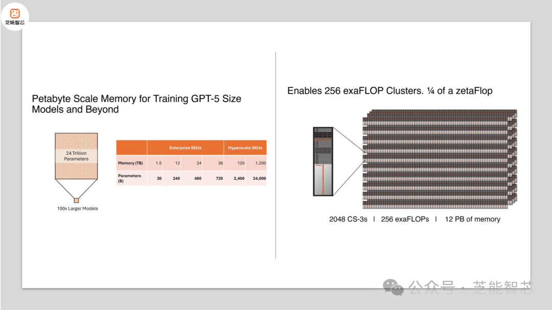 显著特点是更大的集群,多达 2048 个 CS-3,可以实现高达 256 exaFLOPs 的人工智能计算。内存高达 12PB 的超大规模 SKU,专为快速训练 GPT-5 尺寸模型而设计。