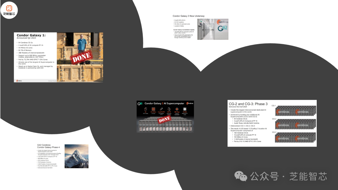 其中一个更新是关于第一个价值超过 1 亿美元的 Cerebras AI 集群,Condor Galaxy 1 已完成并进行客户培训。Condor Galaxy 2,现已在 G42 上启动并运行。新的 Condor Galaxy 3 是达拉斯的集群,它将使用新的 5 纳米 WSE-3 和 CS-3 进行计算。