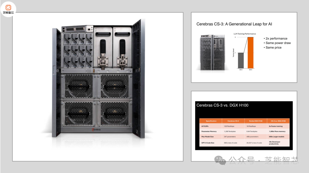 Cerebras CS-3 达到了大约两倍的性能提升,同时功耗和价格保持不变。从第一代的 16 纳米到如今的 5 纳米,Cerebras 在每个工艺步骤中都取得了巨大优势。
