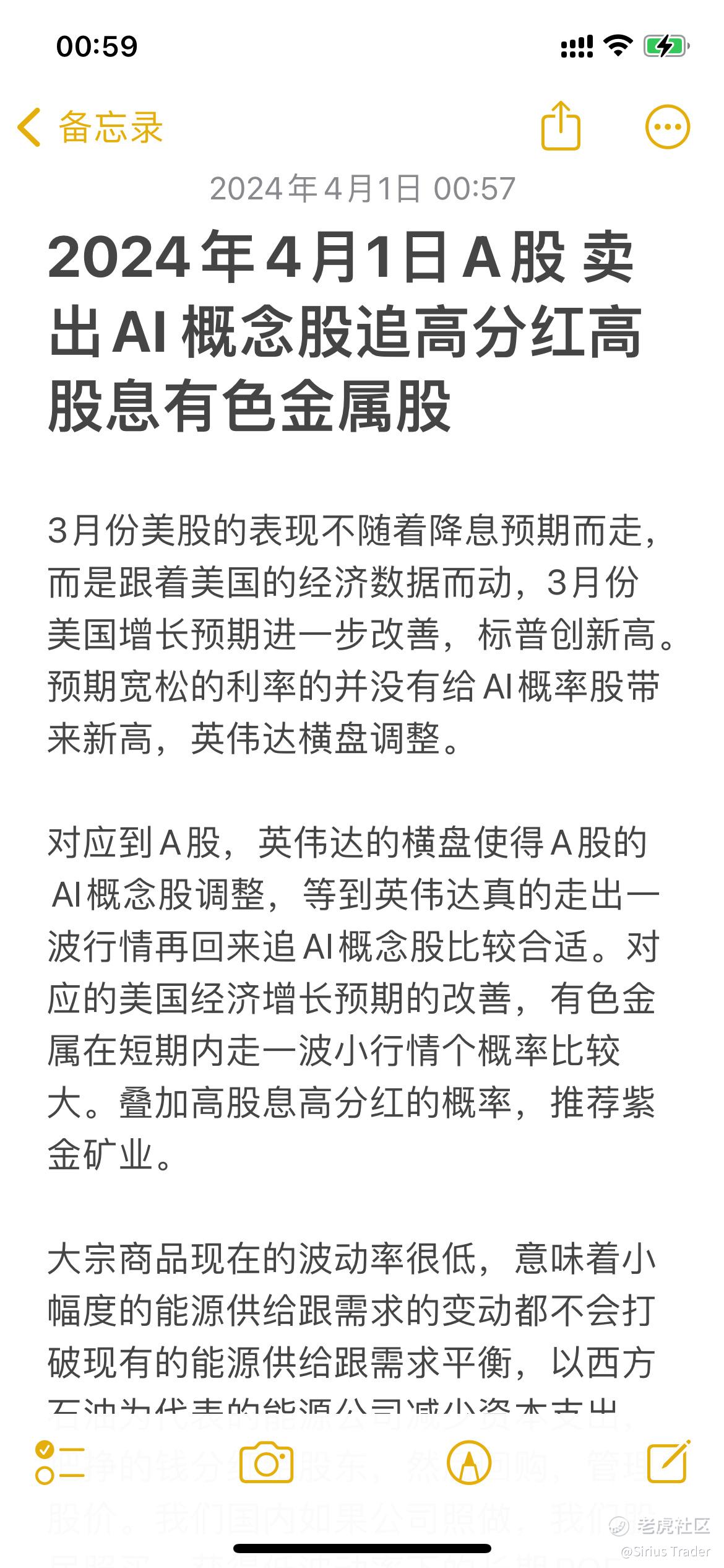 2024年4月1日A股卖出AI 概念股追高分红高股息有色金属股
