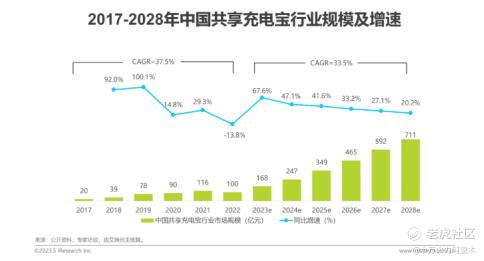 整体看来,线下餐饮、交通出行和酒店住宿场景的显著复苏有望推动共享充电宝行业在2023年增至168亿,并且年化增速持续保持在20%以上,2028年行业规模将超过700亿。