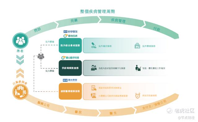 圆心科技的野心并不仅限于此,其目标是整个疾病管理周期,包括问诊、用药、疾病管理、付款等多个环节。除为院外患者提供服务外,圆心科技又陆续推出供给端赋能服务,例如向医院提供标准化模块化软件和系统,以实现医院运营的智能化和优化;以及医疗产业端赋能服务,与保险公司合作,提供保险服务等。