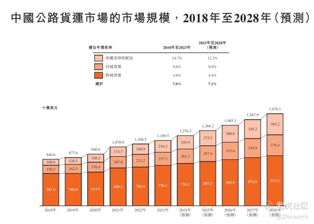 根据弗罗斯特沙利文的数据显示,以GTV为衡量标准,中国在全球公路货运市场中占据领先地位。在2023年,中国的公路货运市场GTV达到了11,895亿美元,占全球市场份额的32.6%,并且预计在2023年至2028年间,市场将以7.1%的年复合增长率持续扩大。庞大的市场需求带来了源源不绝的商户和司机群体,据统计,商户数量约为1.7亿家,而司机人数则高达1,700万左右。