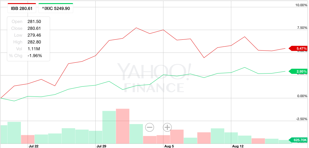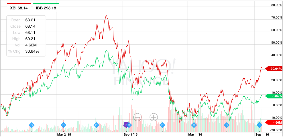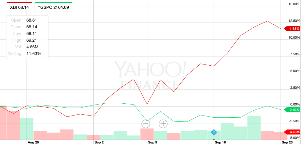 美东时间26日晚上9点(北京时间27日上午9点)就是本轮美国总统竞选第一场辩论,这是一场综合性辩论,很多媒体都说如果是希拉里上台,对生物科技板块会是打击。但是生物科技板块偏偏是本轮领涨的板块,对应标普的$(XBI)$一个月以来大涨11.63%,大大跑赢月收益为负的标普指数。而对应纳斯达克板块的$(IBB)$一个月以来涨幅5.47%,相较月收益2.85%的纳指也相当抢眼。
