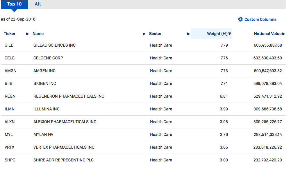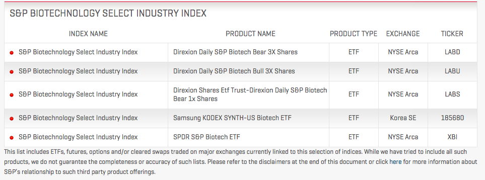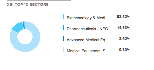 是SPDR公司发行,在纽交所上市,追踪S&P Biotech Select Industry Index这个指数,是标普500全市场生物科技行业公司组成的加权指数,这个指数相关的ETF除了XBI还有带三倍杠杆、正反向的$(LABD)$和$(LABU)$。有兴趣可以看看这个指数的官网: http://us.spindices.com/indices/equity/sp-biotechnology-select-industry-index