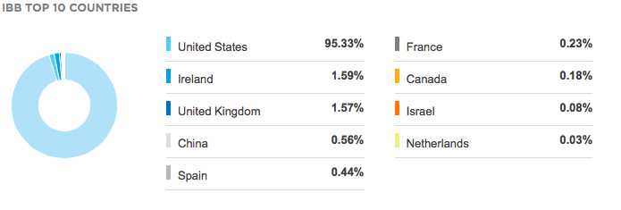 此外,IBB的持仓股票中,除了95%属于美国公司,还有来自爱尔兰,英国等地的。