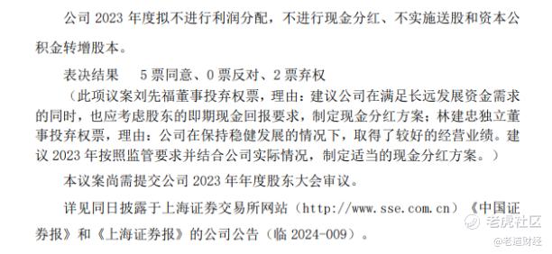 大赚5亿,却一毛不拔?据了解,吉林高速2023年净利润5.46亿元,同比增长近四成;2019 年至 2023 年,五年来,吉林高速的净利润一路狂奔,从1.89亿到5.46亿,连续五年盈利、连续三年盈利增长,但公司现金分红比例可分红比例几乎为0,仅2021年度低比例分红 。自家高管都看不下去了,副董事长刘先福、独立董事林建忠直接对利润分配预案投弃权票。