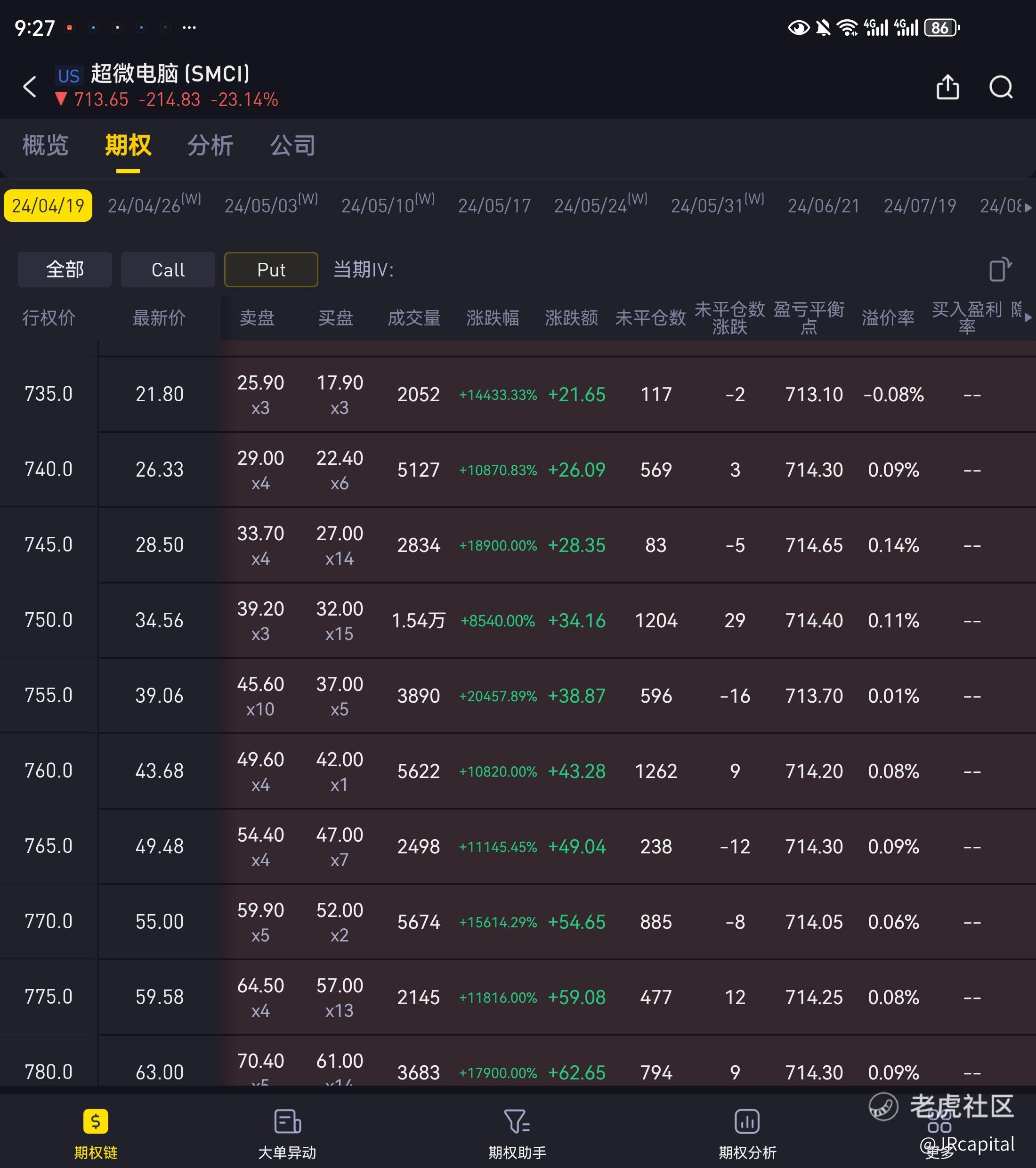 $SMCI 20240419 800.0 PUT$ 买入的这个期权盈利10倍的时候卖了,醒来一看80倍了,虽然挣钱了,但是心情还是很难受,错过的遗憾非常痛苦,这只票周五最高的期权涨了204倍。$英伟达(NVDA)$ $ARM Holdings Ltd(ARM)$ $超微电脑(SMCI)$ $纳指100ETF(QQQ)$