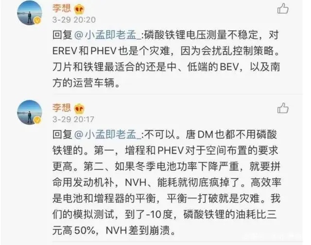 早在2020年,理想汽车创始人李想,曾公开吐槽过磷酸铁锂电池。他认为,对于增程(REV)和多档混动(PHEV)车型来说,使用磷酸铁锂会是一个灾难。