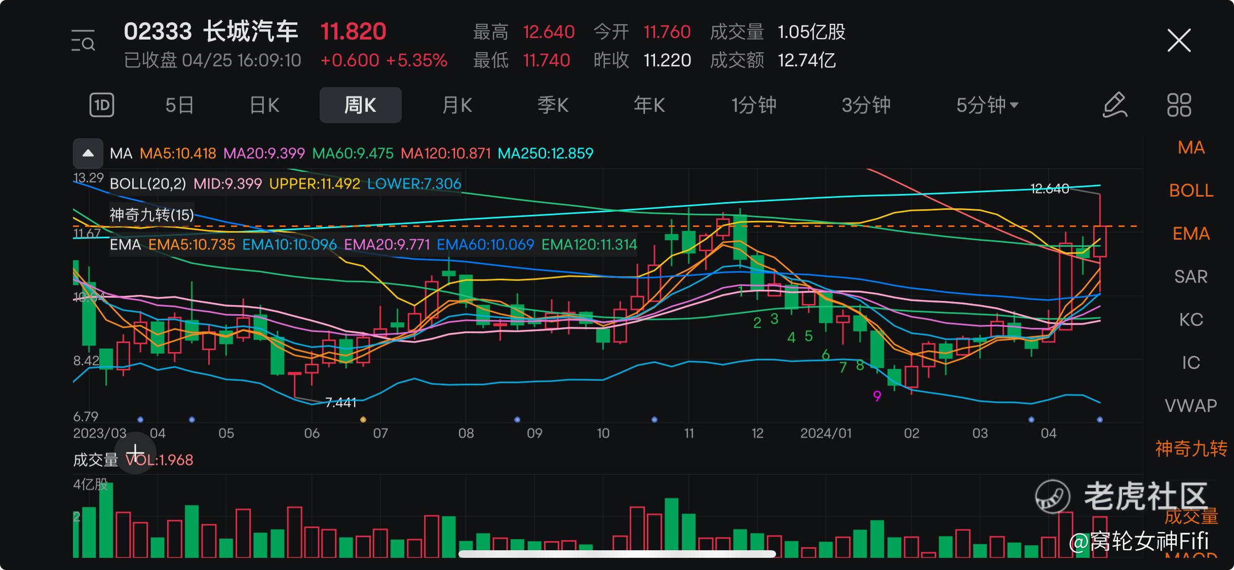 我们从周K线上看到长城汽车在过去一年中,价格起伏较大。