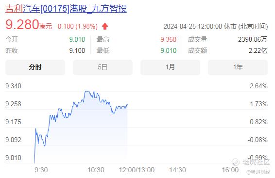 看看车展现场就知道,到处都是人从众,连外国友人都挪不开眼了!车展办的这么好,股价当天开盘也一路上涨,截止4月25日收盘,吉利汽车港股已经涨到了9.2元/股,科技创新的力量,那效果可不就是立竿见影,你看这价值噌噌噌就往上窜了不是?