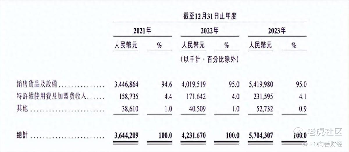而茶百道呢,2023年营收57.04亿,销售费用只有1.31亿。当然,茶百道是赚的加盟商的钱,营收95%来自销售货品及设备,4%是加盟费。