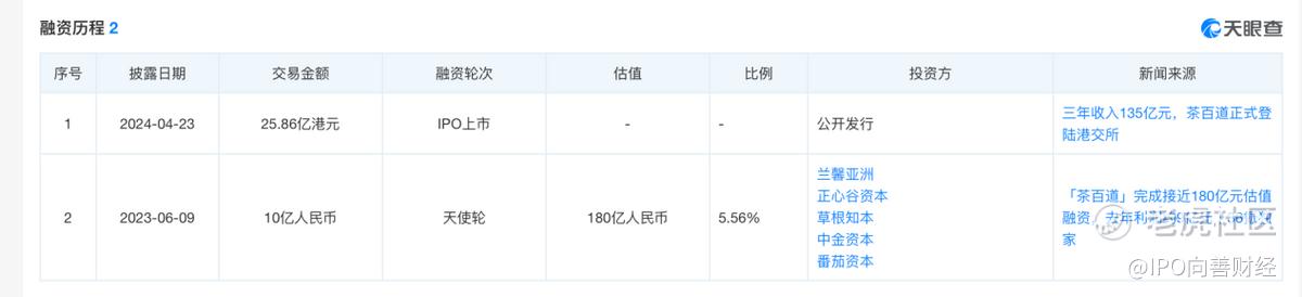 二来,这轮融资,茶百道最被诟病的一点是没有引入基石投资者,且上市前一年进行了Pre-IPO轮融资,另外投后估值180亿确实有点高,市场中的投资者可能很难不去怀疑IPO的真正动机。