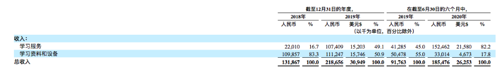 - 洪恩教育的收入来源有两大板块,即学习服务(在线教育)和学习资料和设备(硬件)。2020年上半年,学习服务实现营收1.52亿元,占比82.2%,同比增长269.29%;学习资料和设备营收3301万元,占比17.8%,同比减少34.6%,主要是疫情之后幼儿园和课后学习中心长期关闭所致。2018年、2019年,洪恩教育的学习服务收入分别为2201万元、1.07亿元,同期其学习资料和设备营收分别为1.09亿元、1.11亿元。