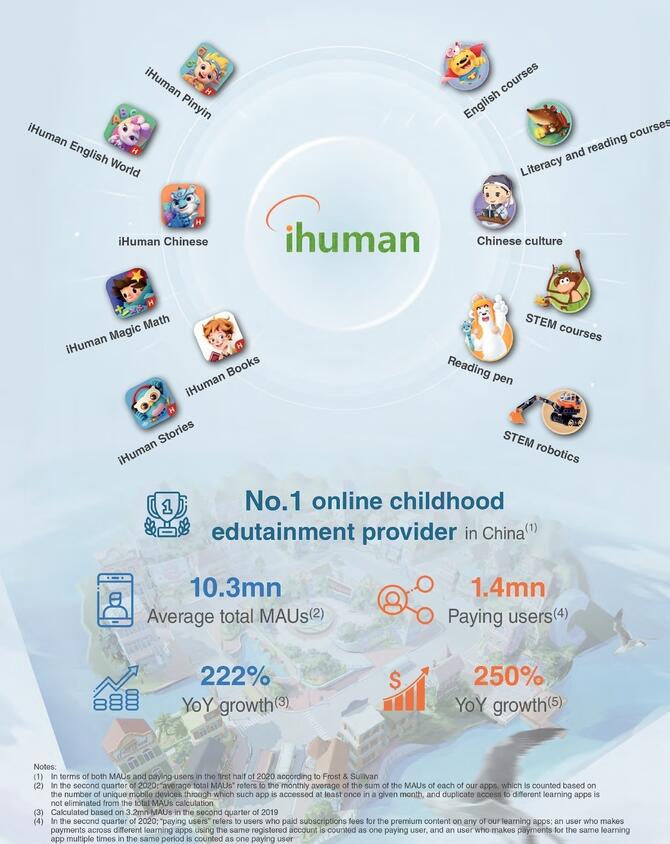 - 根据Frost & Sullivan报告,2020年上半年,洪恩教育的付费用户数和MAU(月活用户数)均在中国在线儿童教育娱乐提供商中排名第一。并且