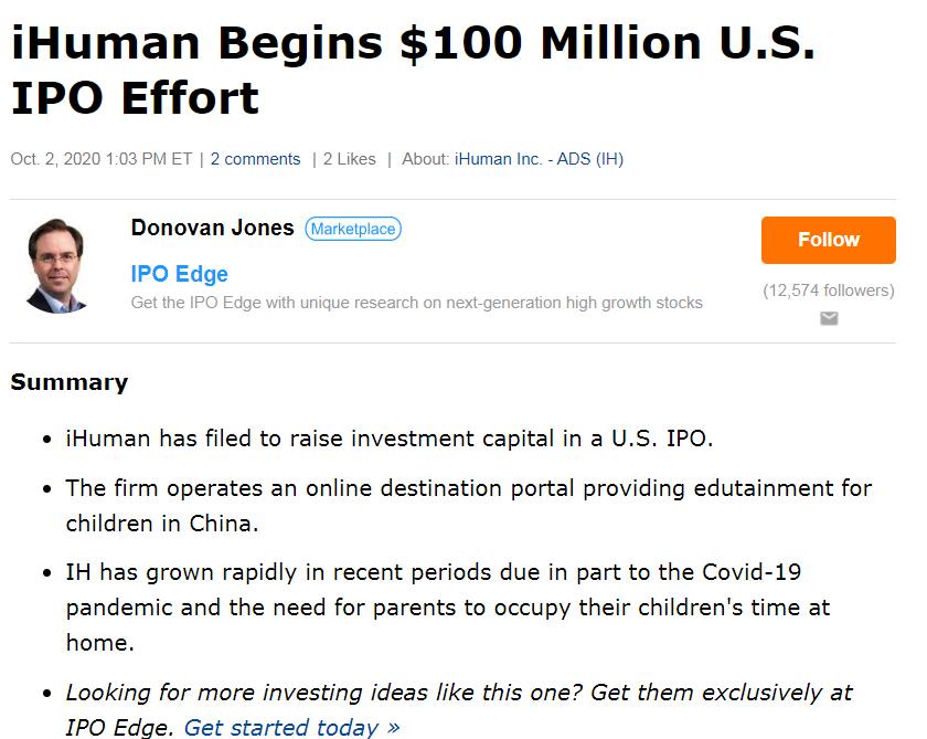 $洪恩教育(IH)$ 网络有说IH为小型企业,受美关注度小,估计只能天朝韭菜自娱自乐。 本人在seekingalpha 上对IH的信息进行了观察。并非内网那样。美网仍然有大哥在少量关注。