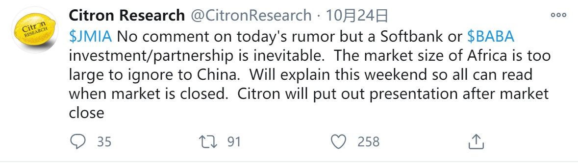 在这篇报道之前,做空者香橼发布了一条推文,称尽管Jumia (JMIA)会对任何谣言发表评论,但软银(SFTBY)或阿里巴巴(BA)的投资/合作是“不可避免的”。